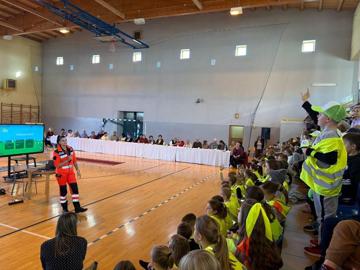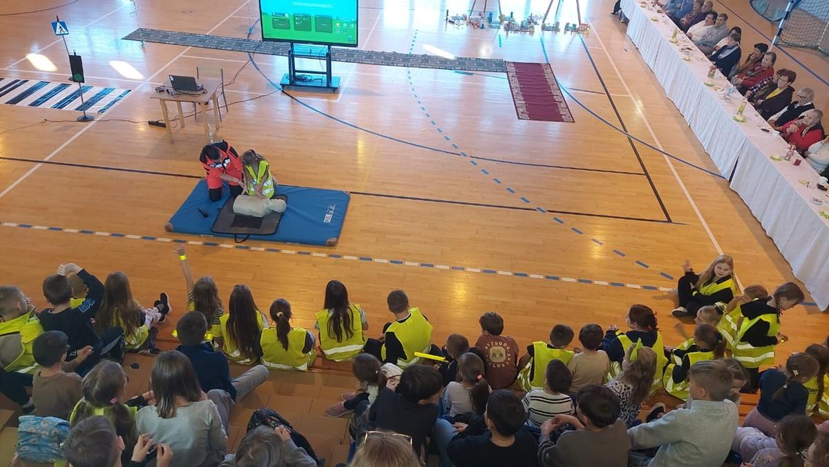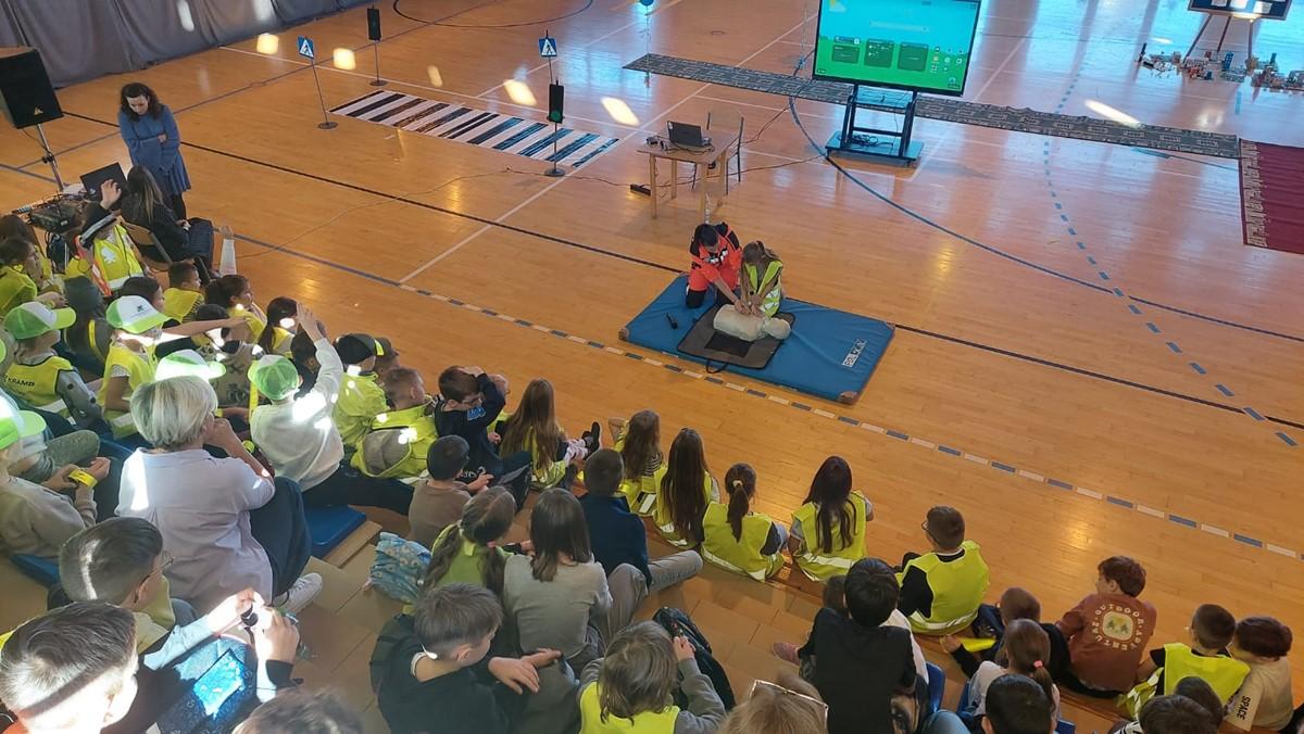Pani Ratownik Elżbieta Klag 🚑 z Sądeckiego Pogotowia Ratunkowego w Nowym Sączu zaprezentowała podstawy udzielania pierwszej pomocy ❤‍🩹, a uczniowie mieli okazję przećwiczyć pozycję boczną ustaloną oraz resuscytację krążeniowo-oddechową 🫁.
