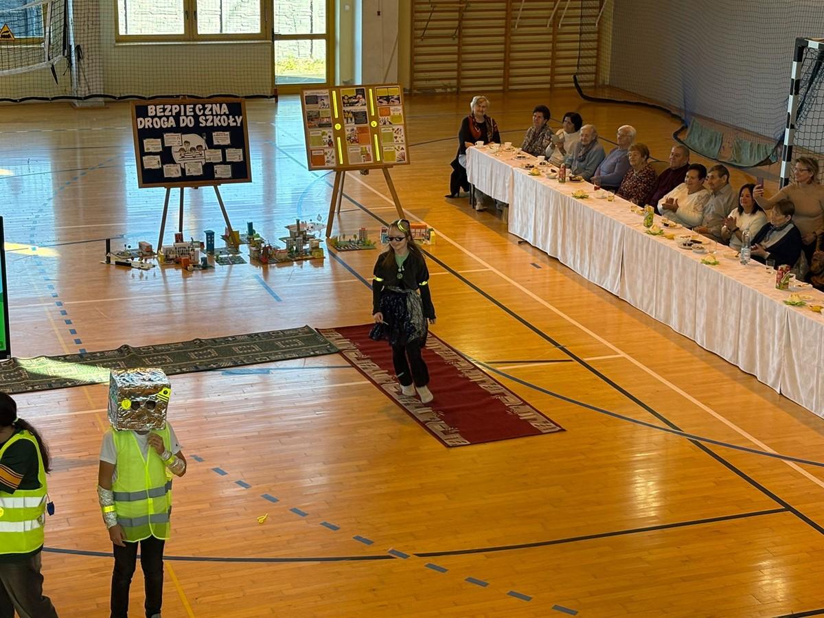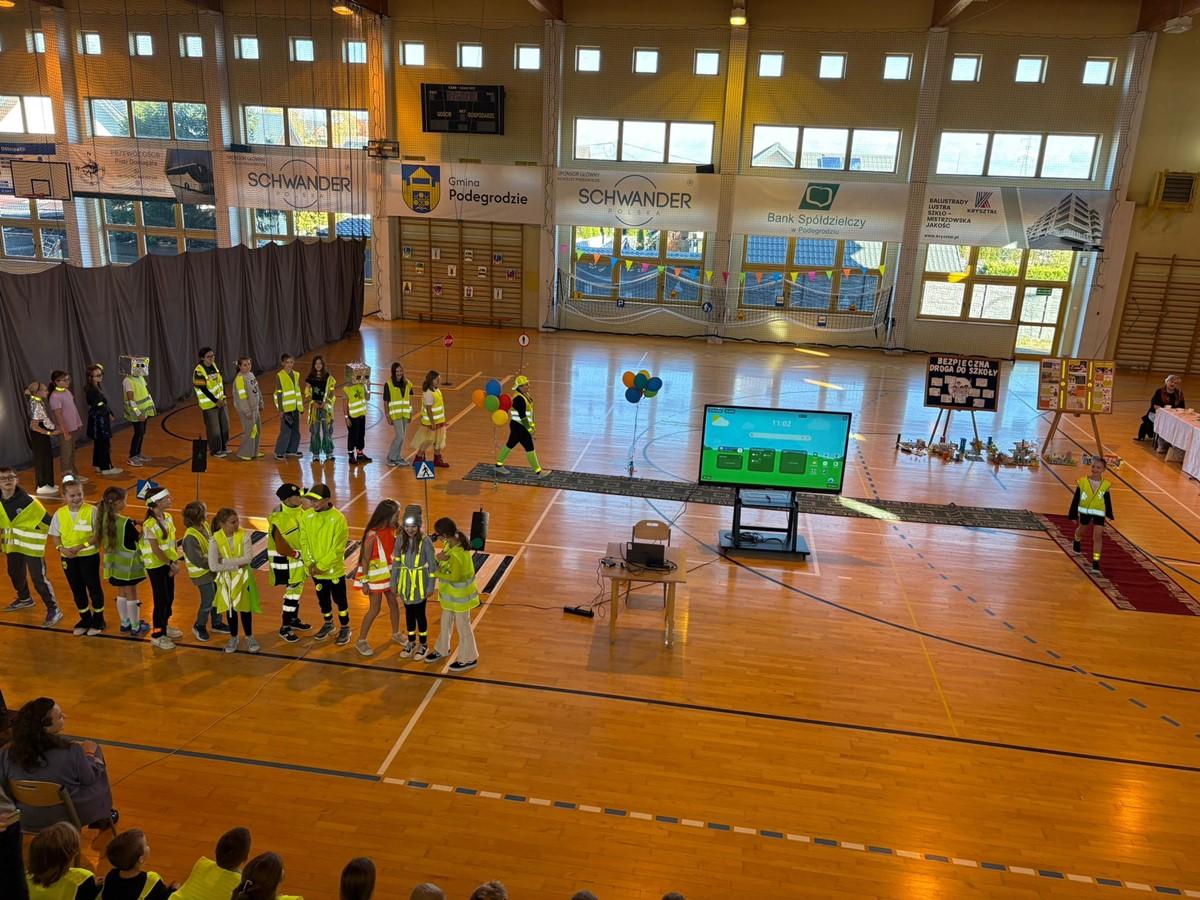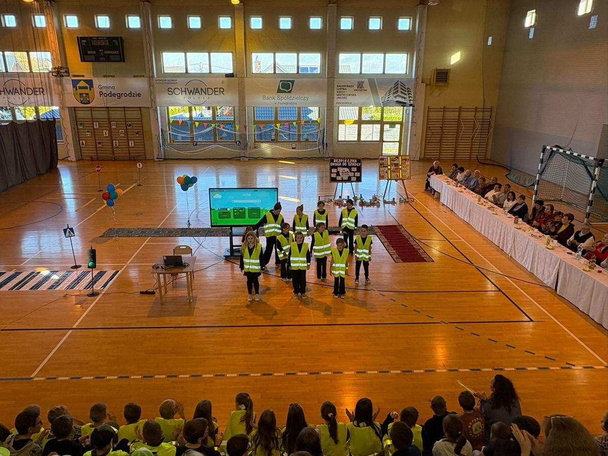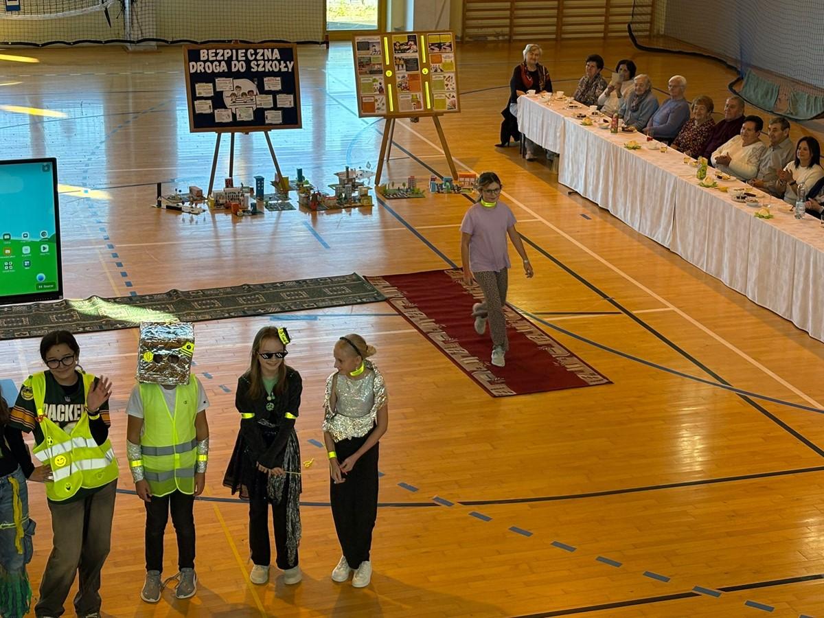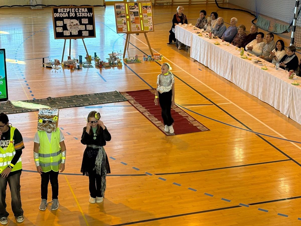 Uczniowie zaprezentowali piosenkę i taniec w odblaskach 💃🕺, a kulminacyjnym punktem programu był „Pokaz Mody Odblaskowej” 👗🦺, w którym młodzi modele i modelki udowodnili, że bezpieczeństwo może iść w parze ze stylem ✨.