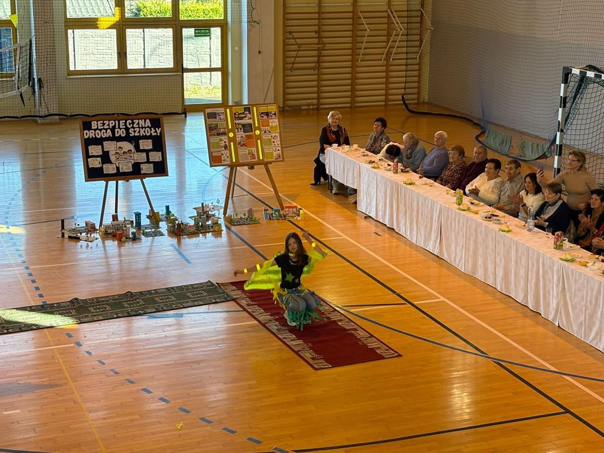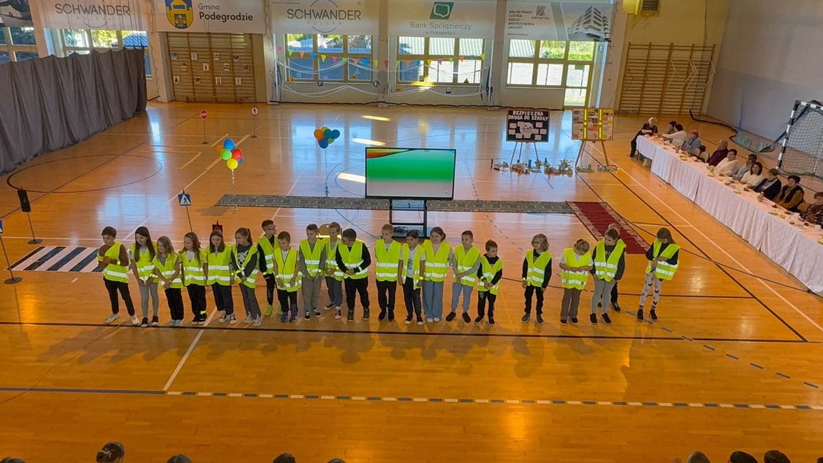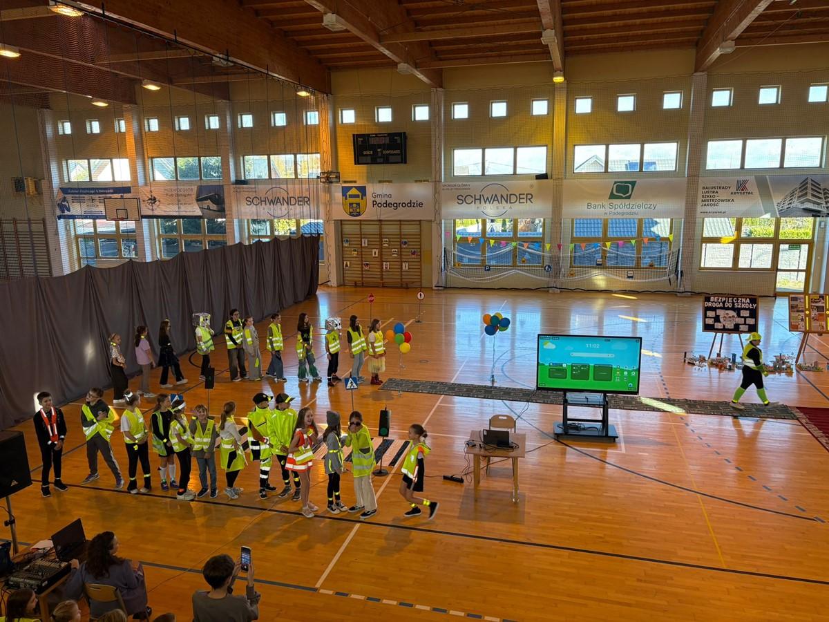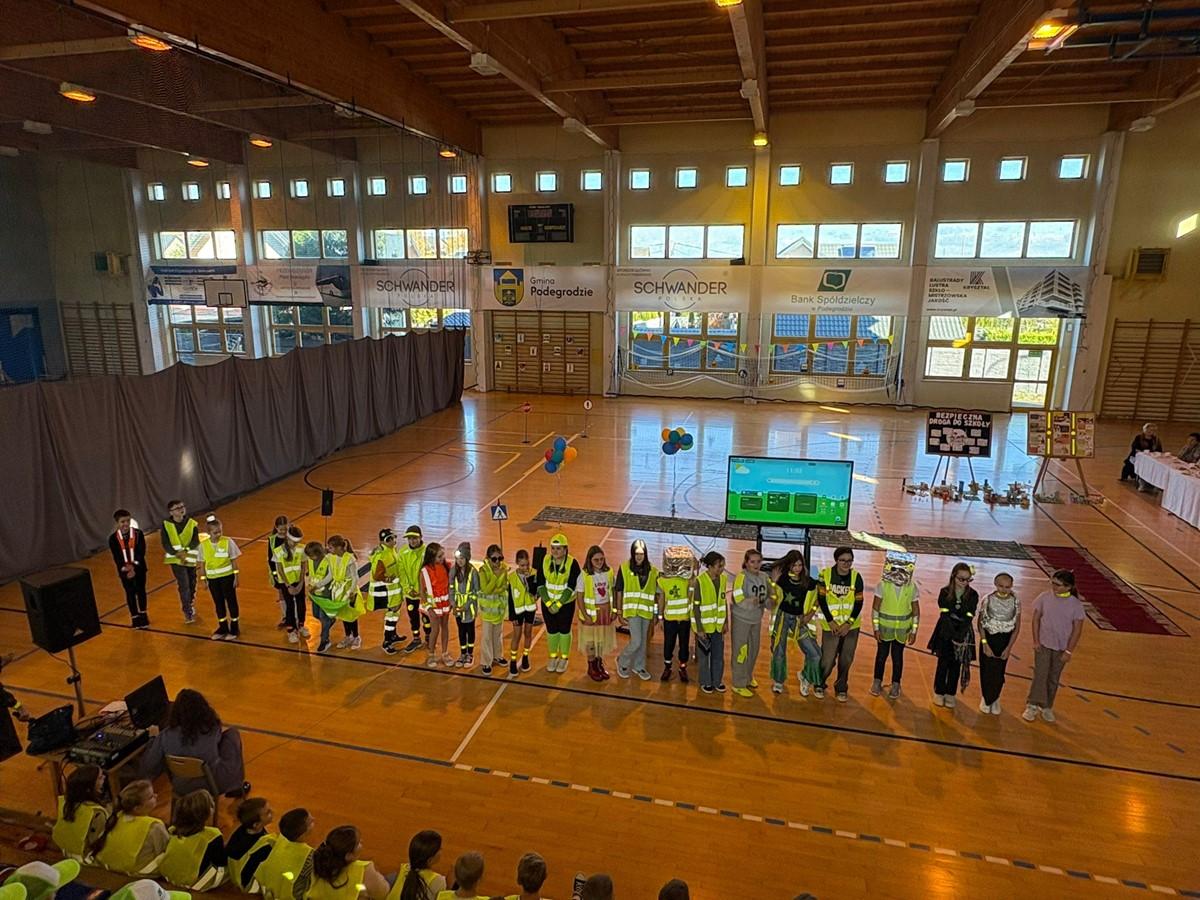 Uczniowie zaprezentowali piosenkę i taniec w odblaskach 💃🕺, a kulminacyjnym punktem programu był „Pokaz Mody Odblaskowej” 👗🦺, w którym młodzi modele i modelki udowodnili, że bezpieczeństwo może iść w parze ze stylem ✨.