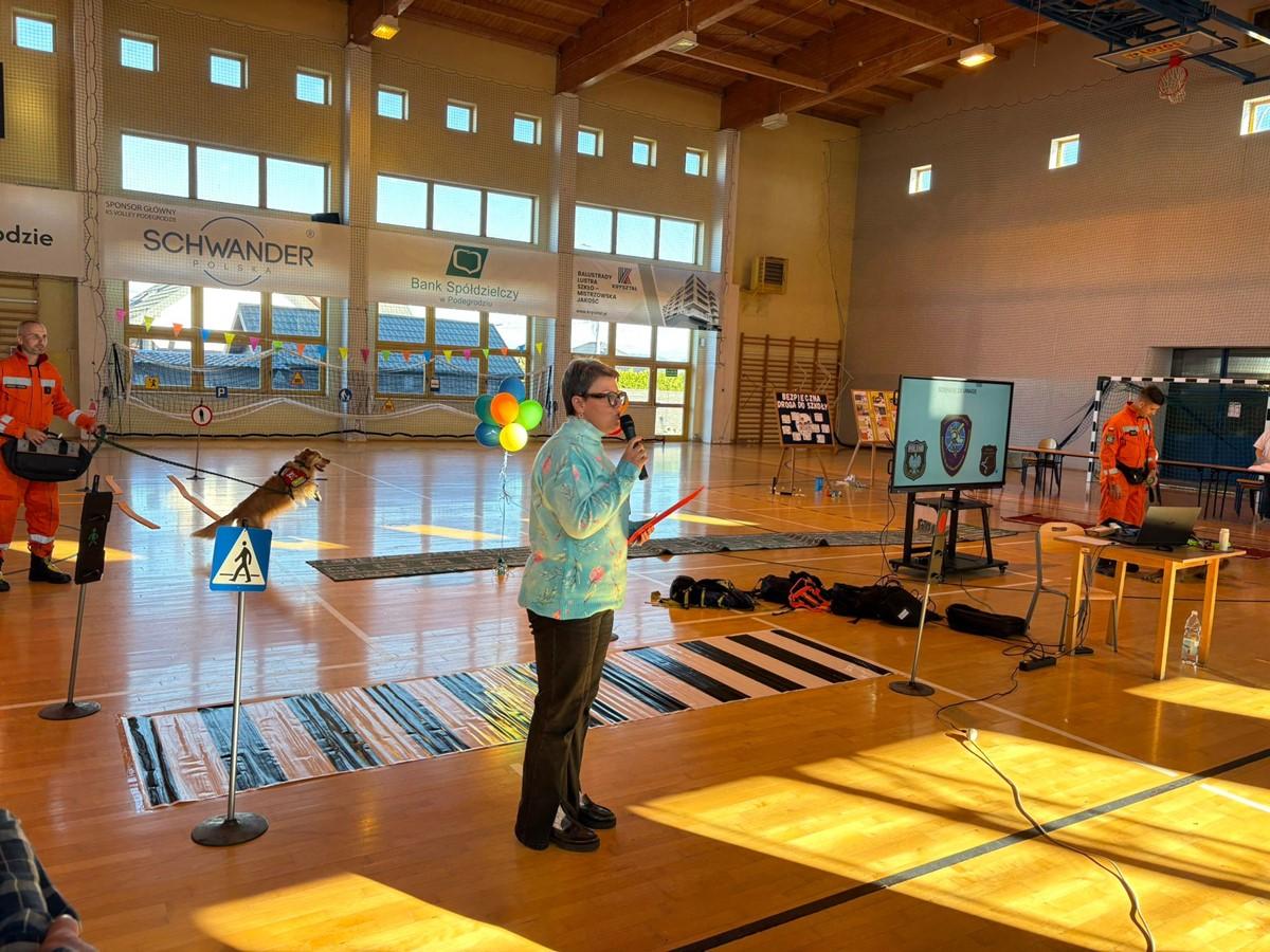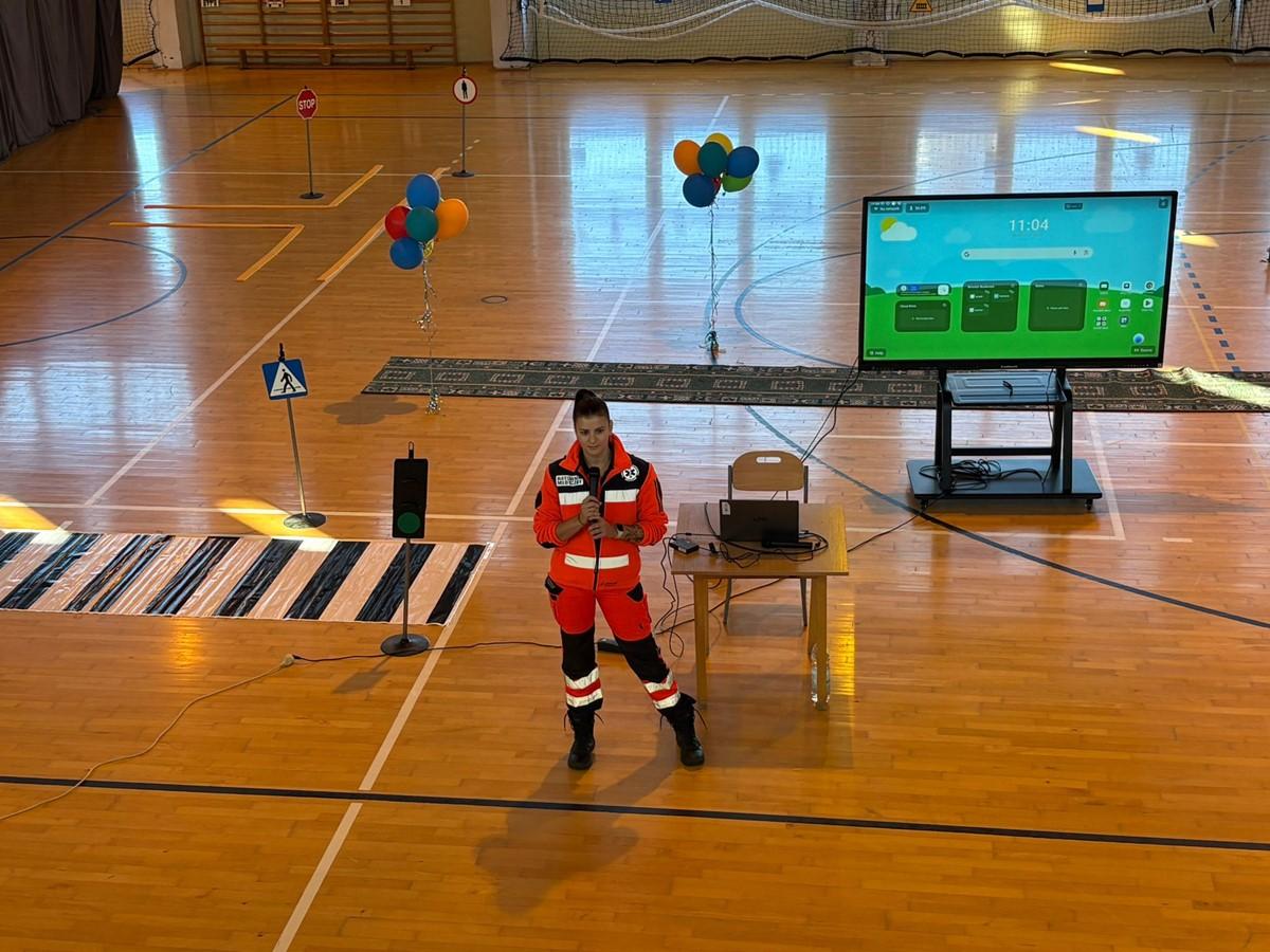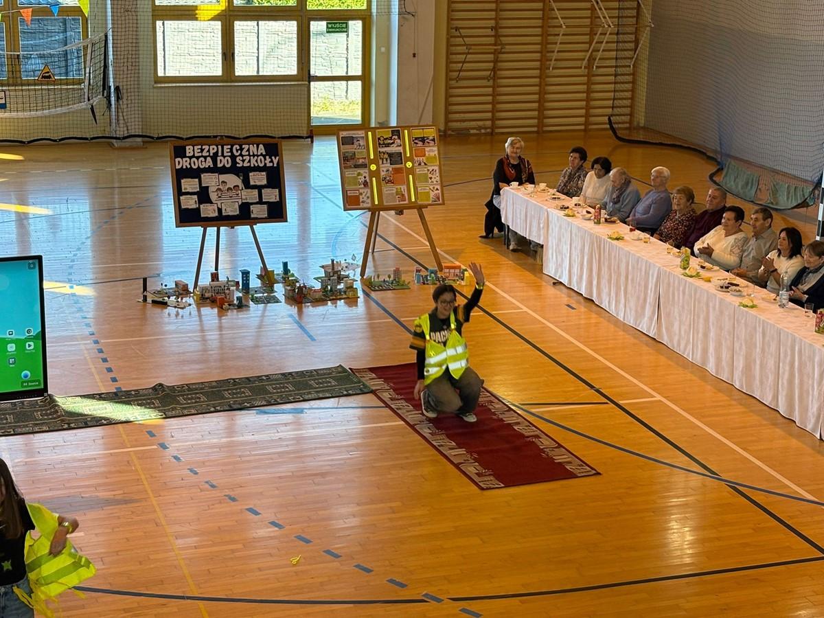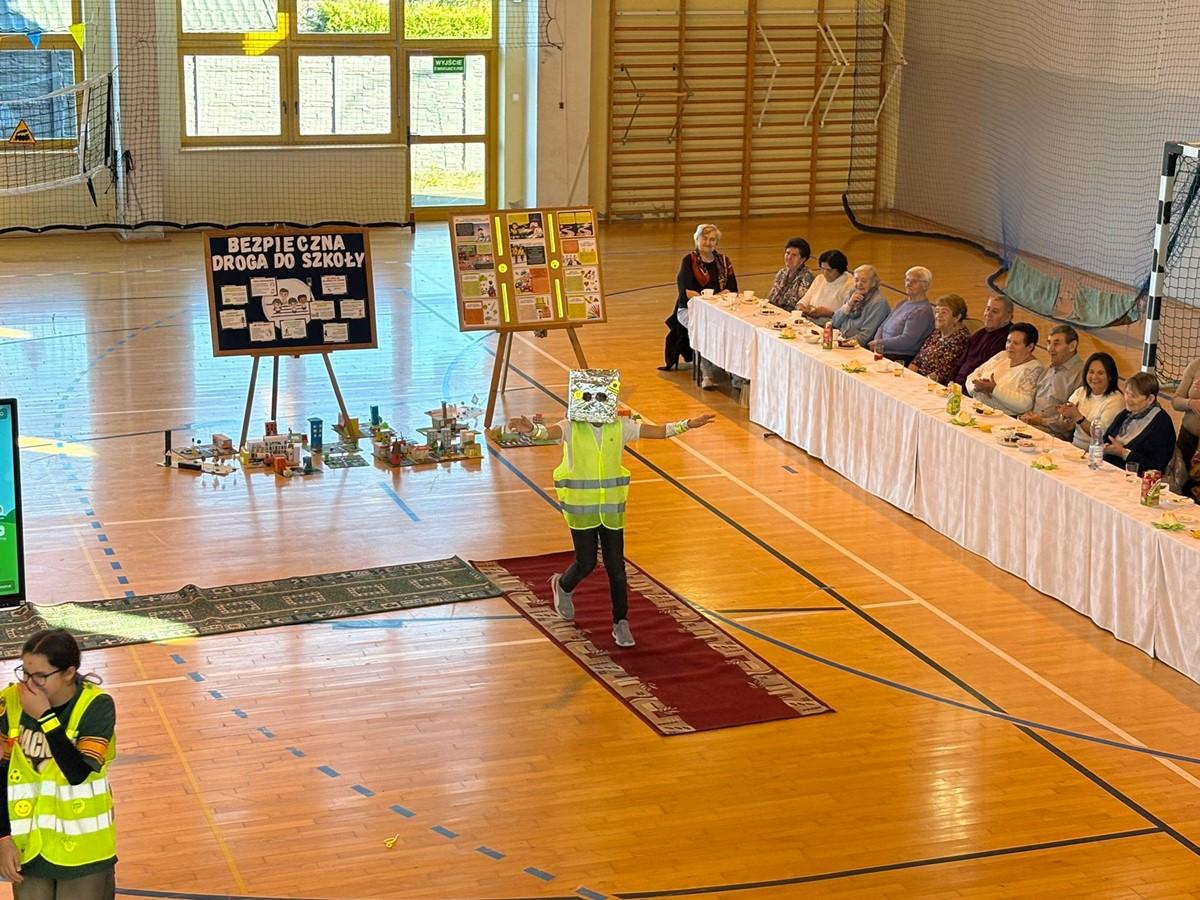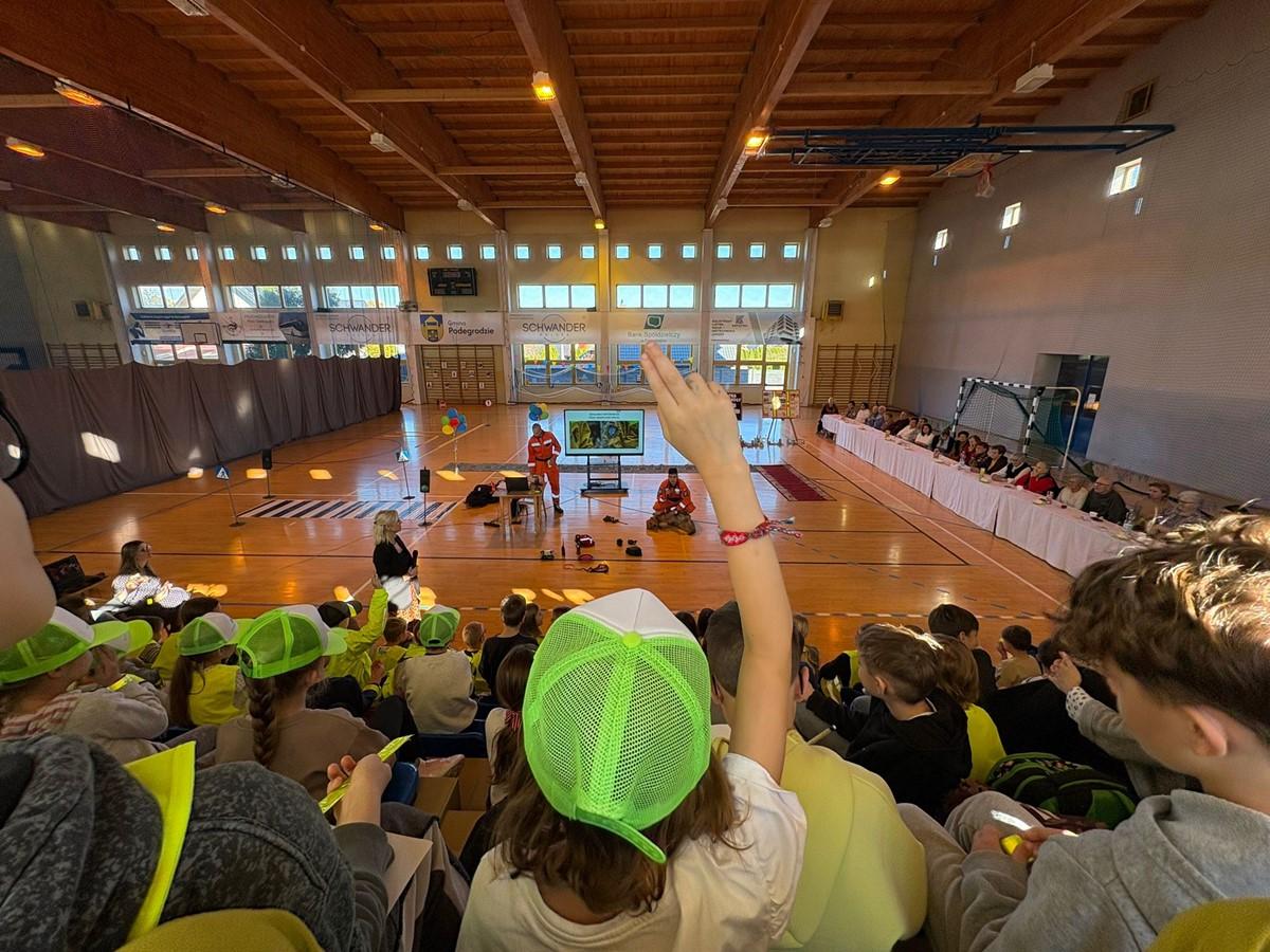 Uczniowie zaprezentowali piosenkę i taniec w odblaskach 💃🕺, a kulminacyjnym punktem programu był „Pokaz Mody Odblaskowej” 👗🦺, w którym młodzi modele i modelki udowodnili, że bezpieczeństwo może iść w parze ze stylem ✨.