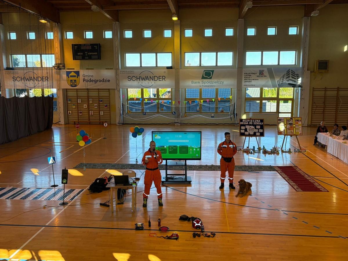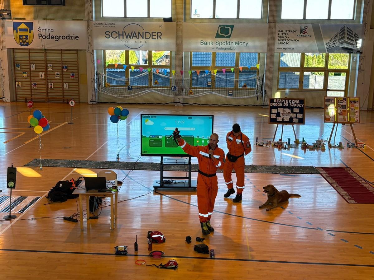Ogromną niespodzianką 🎁 była wizyta strażaków z Komendy Miejskiej Państwowej Straży Pożarnej w Nowym Sączu 👨‍🚒, którzy przybyli z psami ratowniczymi 🐕‍🦺 – pan Sebastian Janczura i pan Grzegorz Taraska wraz z psami Barym i Nuką 🐾.