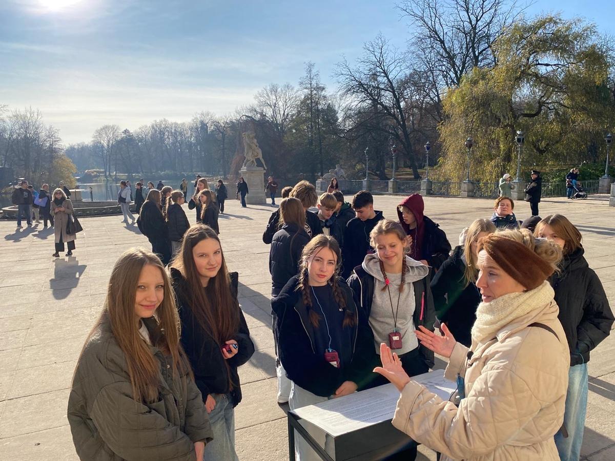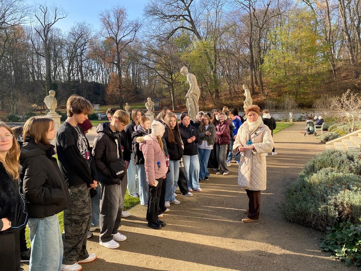 Pierwszym punktem programu było zwiedzanie Królewskich Łazienek, jednego z najpiękniejszych parków Warszawy. Uczniowie poznali historię tego miejsca oraz zwiedzili Pałac na Wyspie, zachwycając się jego architekturą i wnętrzami.