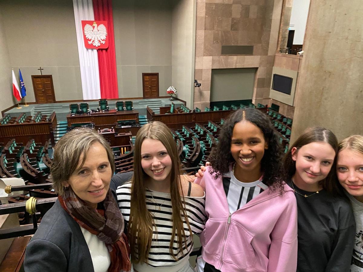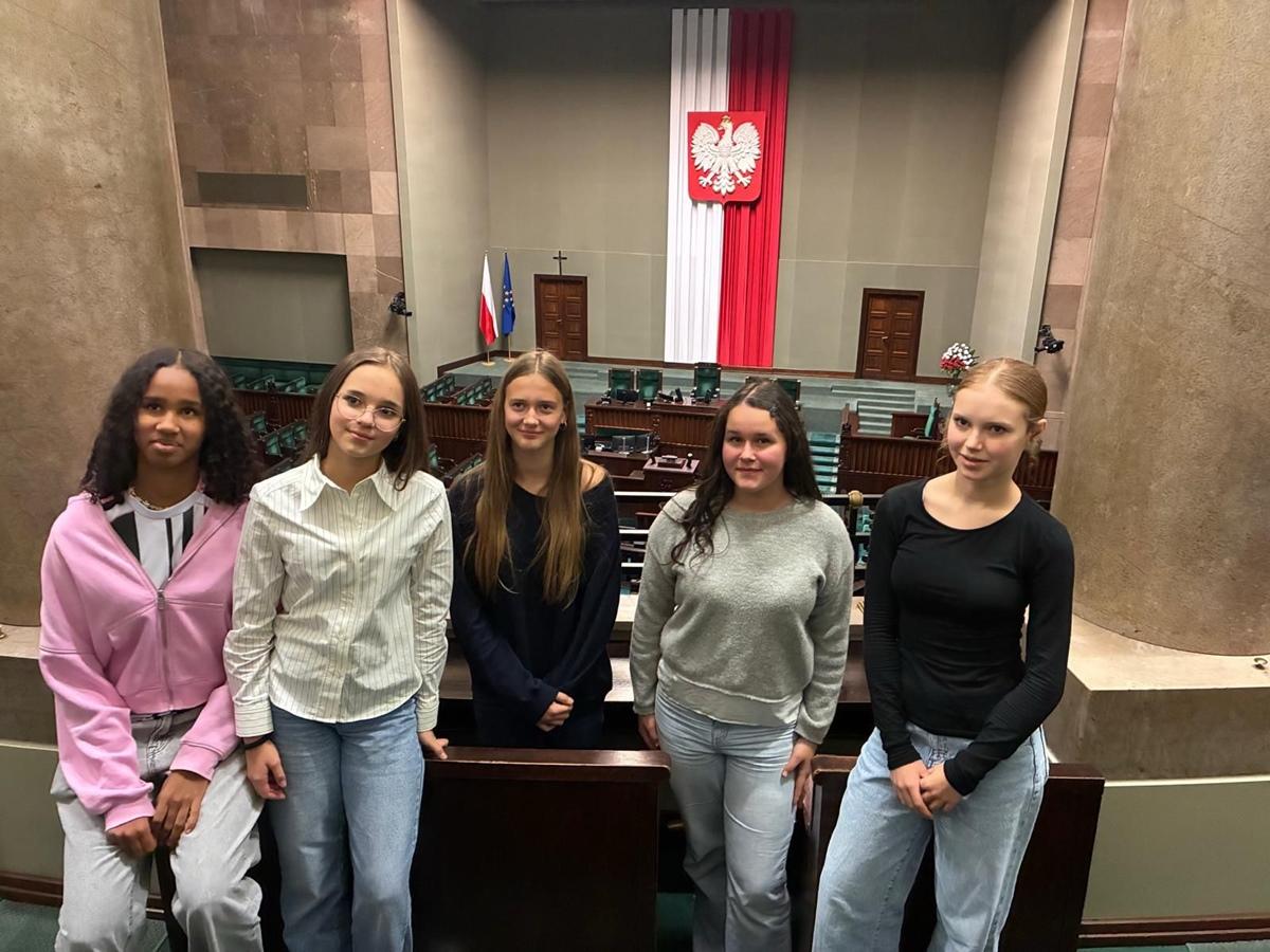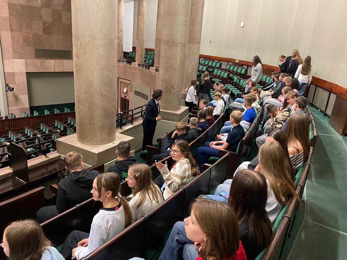 Po krótkim odpoczynku w Złotych Tarasach uczestnicy przenieśli się do serca polskiego parlamentaryzmu – Sejmu RP. Podczas zwiedzania z przewodnikiem uczniowie mieli okazję zobaczyć sale sejmowe, poznać zasady funkcjonowania władzy ustawodawczej i dowiedzieć się, jak wygląda codzienna praca posłów.