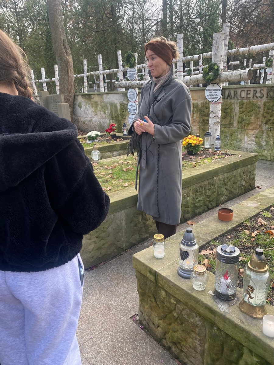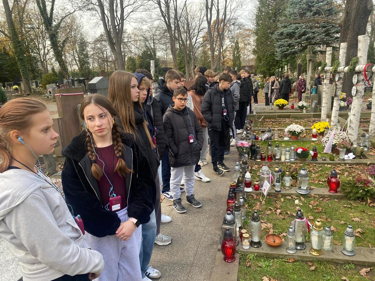 Kolejnym punktem programu był spacer po Cmentarzu Powązkowskim, jednej z najważniejszych polskich nekropolii. Uczestnicy uczcili pamięć wybitnych postaci kultury, polityki i historii Polski, a przewodnik opowiadał o bohaterach spoczywających na Powązkach.